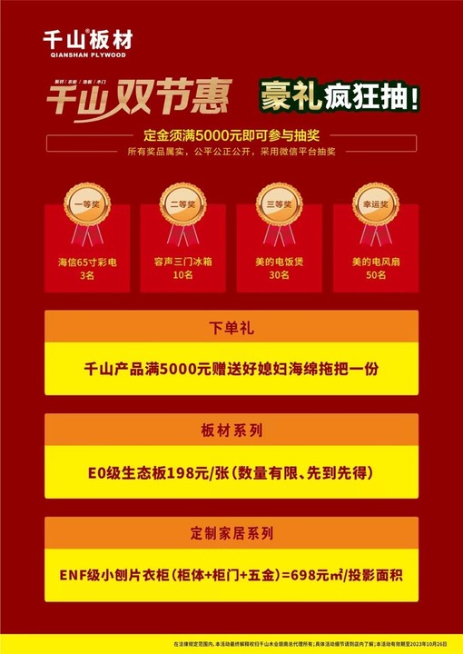 2023年9月26日,千山板材第五屆雙節(jié)惠暨千山板材新品發(fā)布會在江西省贛州市火爆開啟!活動時間長達一個月,工廠直供,產(chǎn)品質(zhì)量優(yōu)異,價格實打?qū)崈?yōu)惠!本次活動不僅為消費者提供了勁爆的優(yōu)惠政策,更是奉上了一系列驚喜豪禮與真摯服務(wù)。
