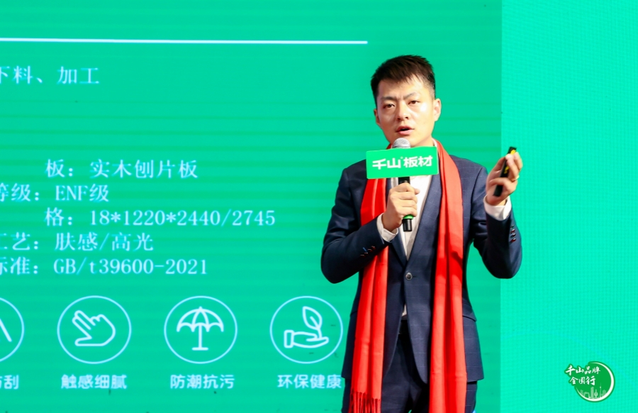 活動現場,千山板材全新產品驚艷亮相,并由大區經理史生平進行產品解讀。千山聚焦市場和用戶需求,將工藝、功能、美學貫徹到產品升級中,打造更全、更精的產品體系。
