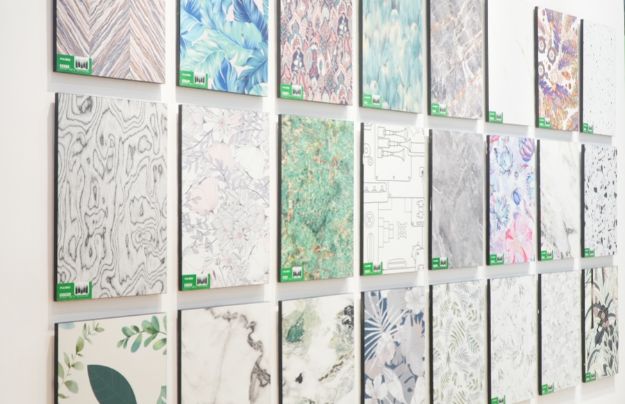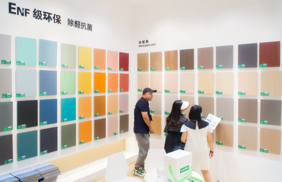 千山板材展館以6大系列花色矩陣呈現,分為6大展區:木紋系列32款,純色系列41款,布紋石紋系列8款,高定系列10款,數碼系列24款,門板系列12款,127款潮流花色詮釋千山板材對于時尚家居的探索和引領。