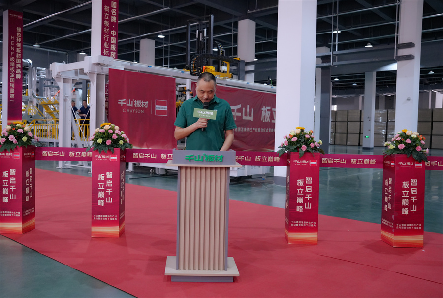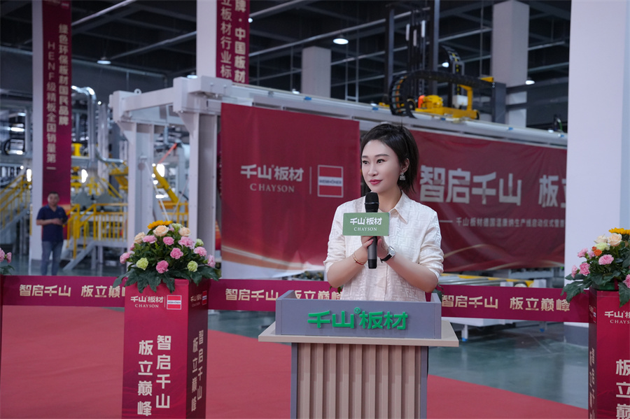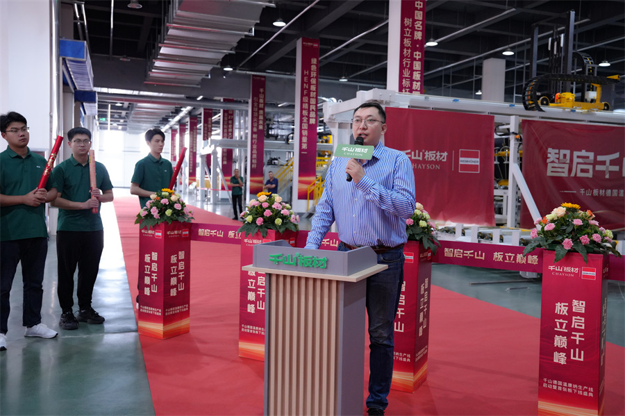 隨著彩帶落剪,啟動指令同步發出,德國溫康納生產線開啟運轉!當第一張經由新生產線制造出的板材緩緩輸送至下線口時,全場掌聲雷動,不僅宣告了千萬級生產線的圓滿調試成功,更象征著千山品質新紀元的開啟。