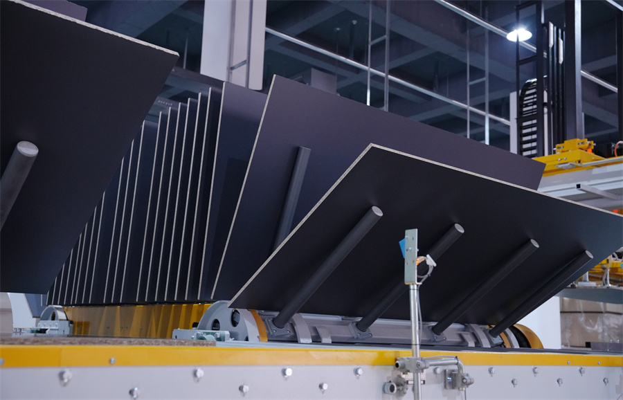 溫康納智能化產線實現全流程自動化無縫銜接,從自動上下料、自動進板裝置到壓機壓貼、清邊倒角、翻板檢驗等,每個環節都實時調控。更令人驚嘆的是紅外激光精準對紋系統,將誤差嚴格控制在毫米級以內,使板材紋理對接的美觀度實現質的飛躍。