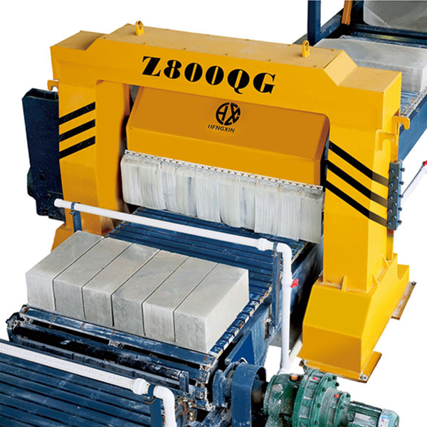首先是通過Z1600QZ流水線切割機,進行第一次成品切割,Z1600QZ流水線切割機是采用金剛石刀頭,德國進口鋼片制成的刀片精致而成經(jīng)久耐用。進行完第一次流水線切割后,通過90翻轉機對坯體進行水平方向90度旋轉,改變切割方向。再通過扳倒機對改變過方向的坯體進行翻倒,然后輸送給Z800QG切割機,進行第二次成品切割。