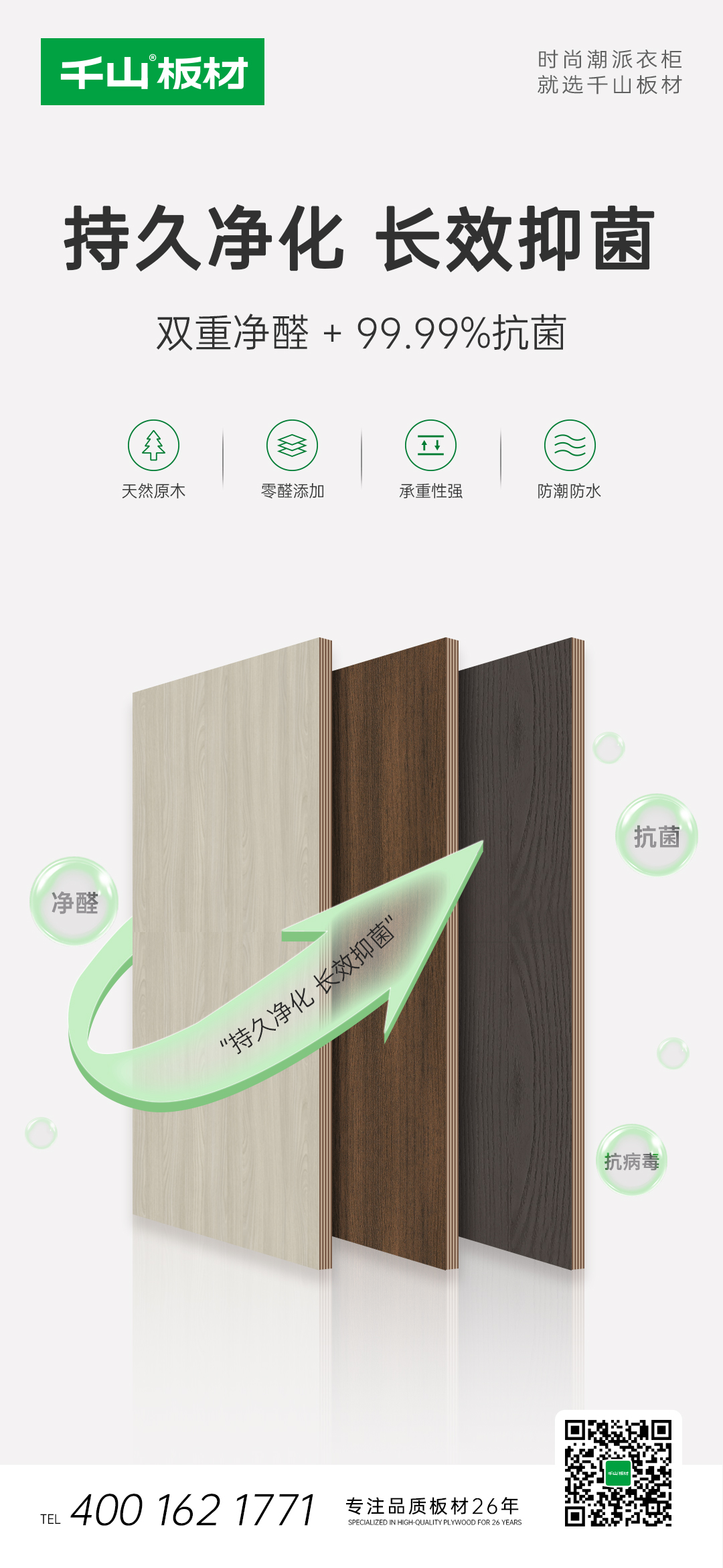 凈醛多層板擁有凈醛抗菌抗病毒超強(qiáng)飾面,能夠主動(dòng)捕捉甲醛,并將其分解為二氧化碳和水,持久凈化室內(nèi)空氣。通過(guò)抗菌抗病毒活性成分,抑制大腸桿菌、金黃色葡萄球菌等微生物生長(zhǎng),抗菌率及抗病毒活性率>99.9%,讓健康更“凈”一步!