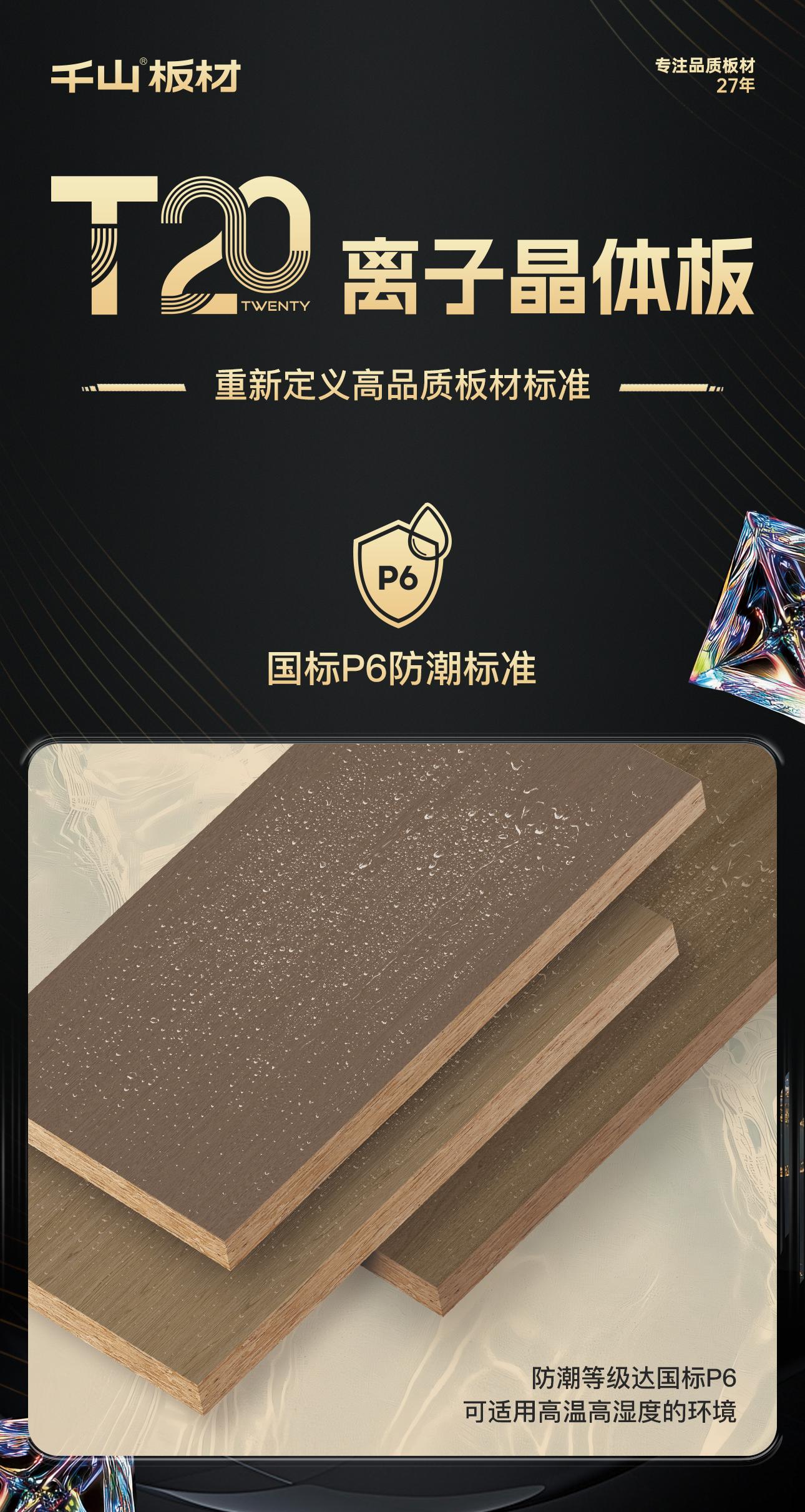 千山板材重磅推出T20離子晶體板,以20mm厚度、高強承重、高能抗變形、超強耐磨的優異性能,顛覆傳統門板的性能界限,重新定義高品質板材標準,實現產品穩定性與空間美觀性的極致效果,成就柜體柜門通配、一門到頂的超能應用。